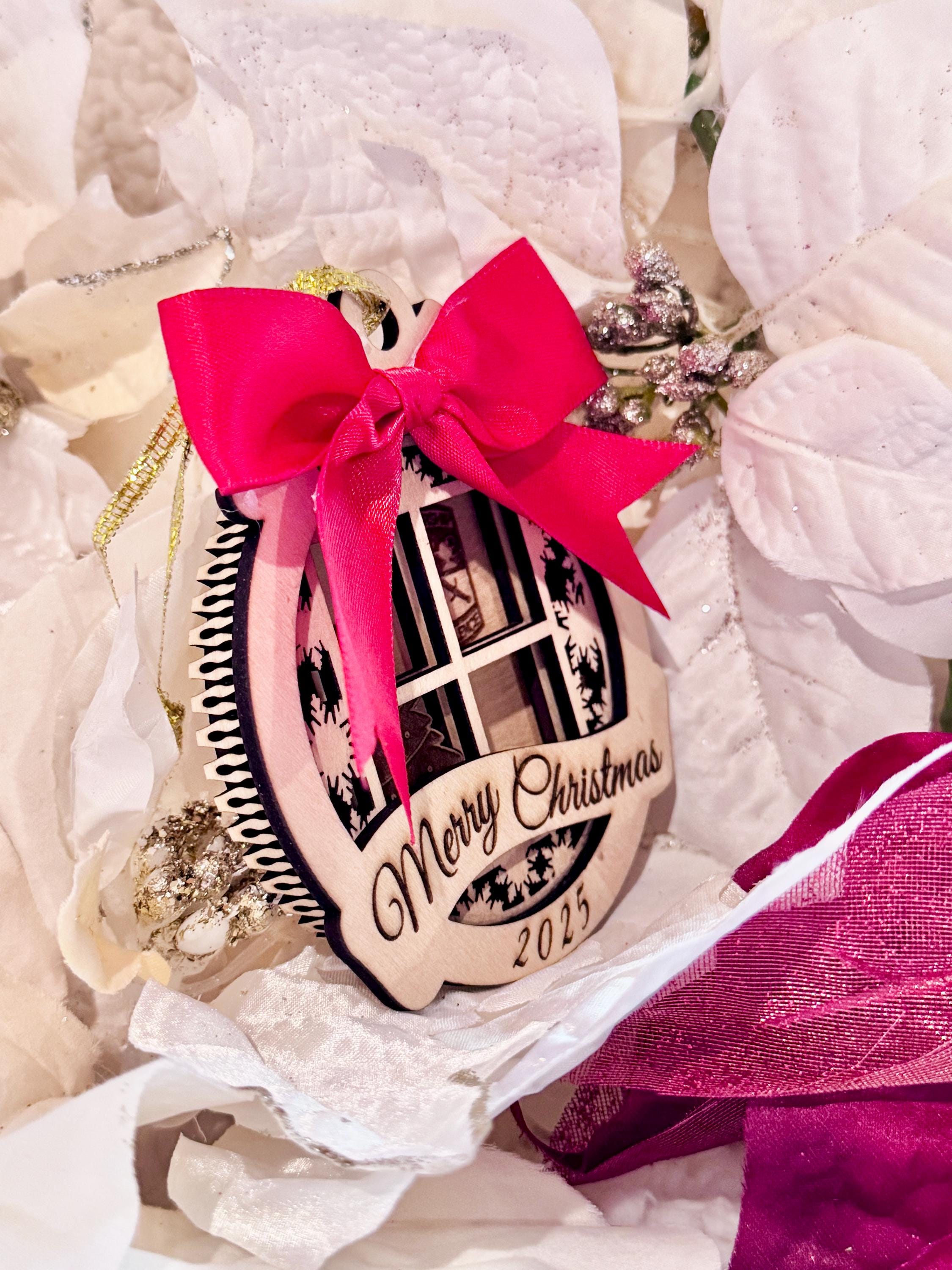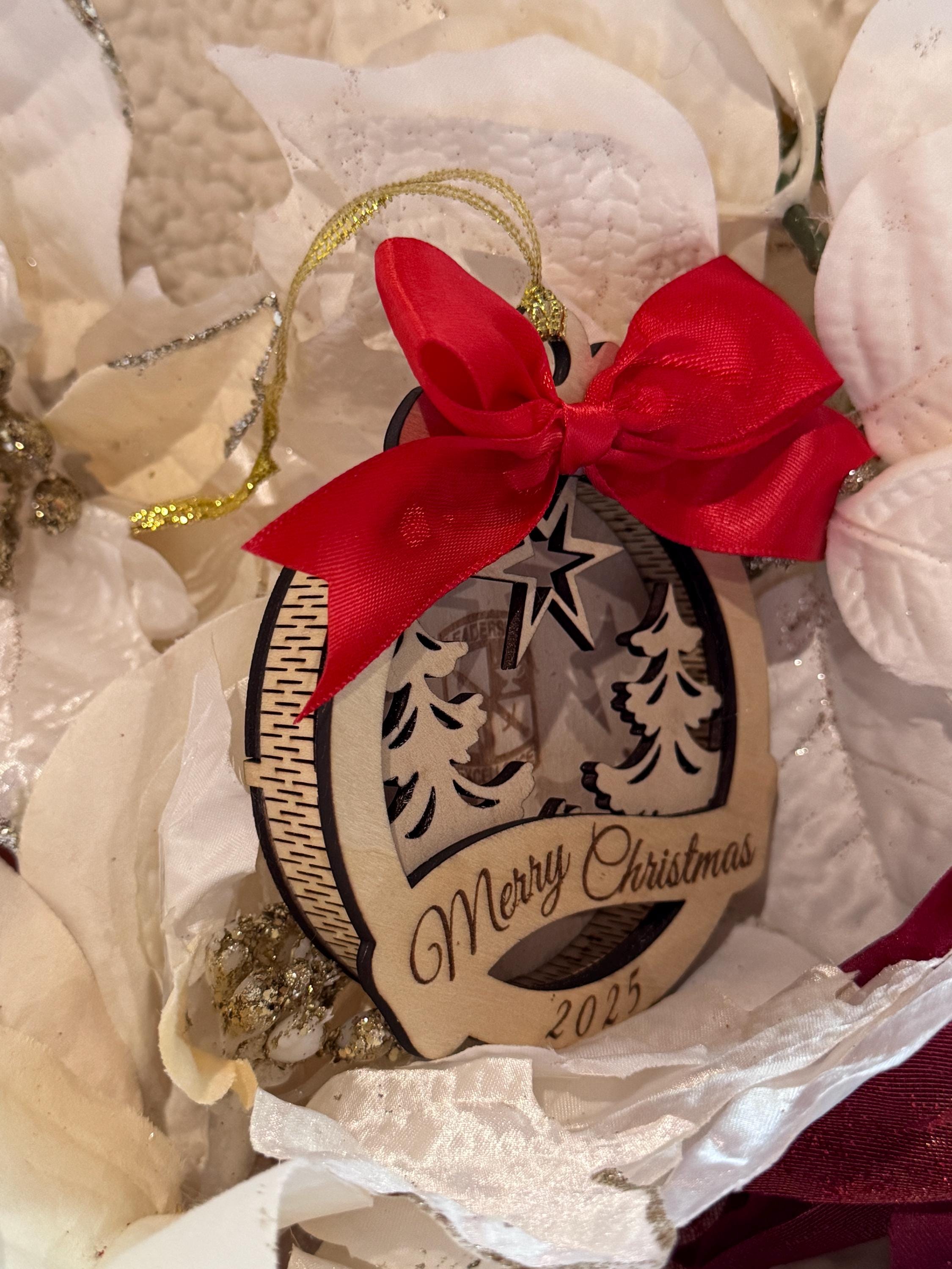 Layered wooden Christmas ornament featuring Christmas tree and Army unit crest with Merry Christmas banner and 2025.