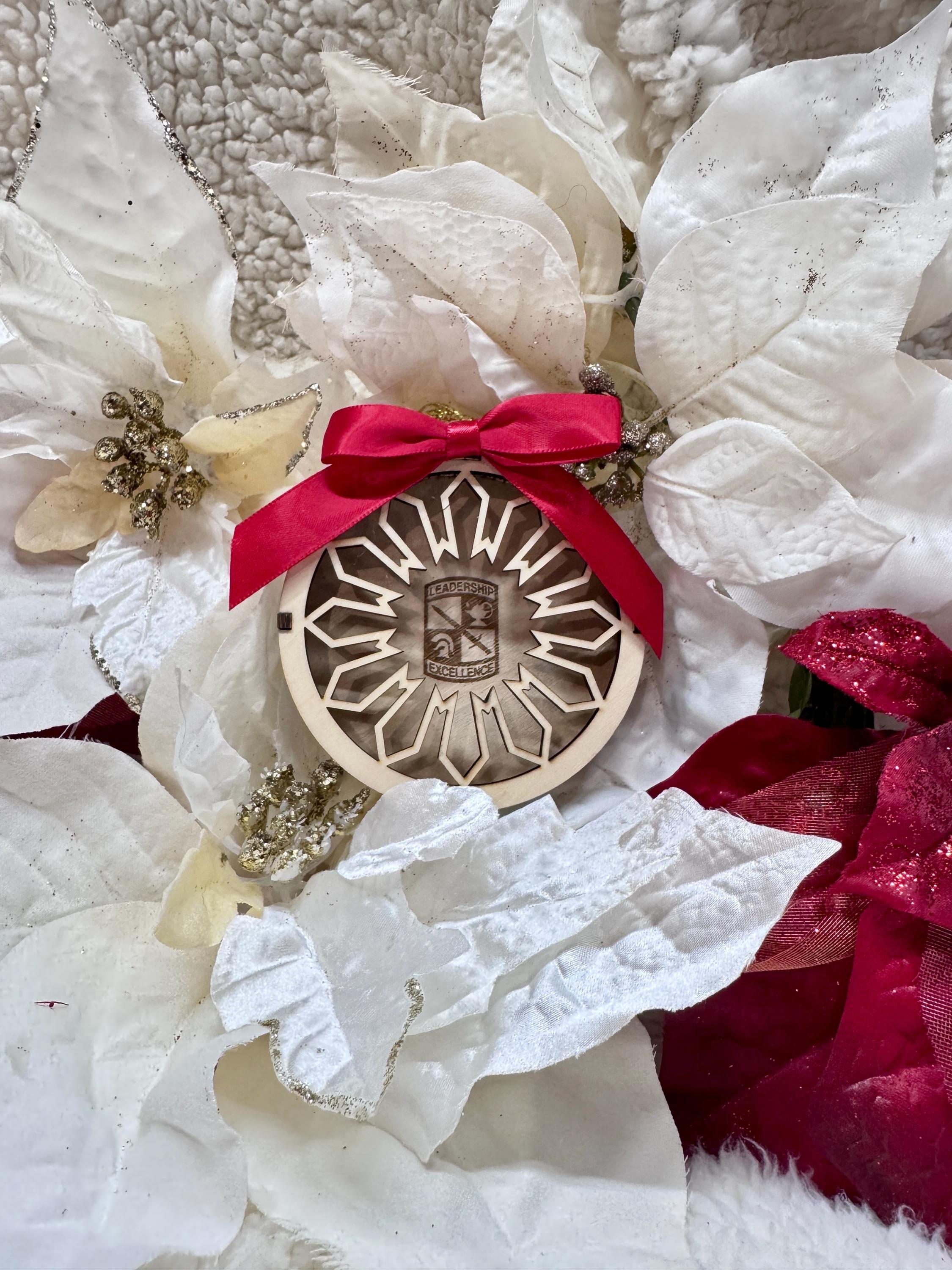 Layered wooden Christmas ornament featuring Christmas tree and Army unit crest.